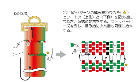 2 ステッチ用金具(K4943/G)に1)のシートを通し、残しておいた糸でつなぎ、糸始末する。