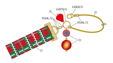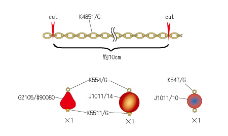 4 2)・3)・ステーションパーツ(K4978/G)・太リング(K544L/G)・カニカン(K4908/G)をつないで出来上がり。