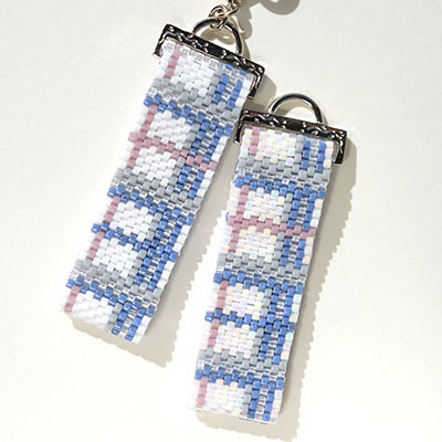 白をベースにした、タータンチェック柄が可愛いバッグチャームのご紹介です。デリカビーズのシートは、ペヨーテステッチの技法で編んでいます。チェック柄のチェッカーパールとツヤツヤの変形トライアングルビーズを添えて、大人可愛い仕上がりになっています。