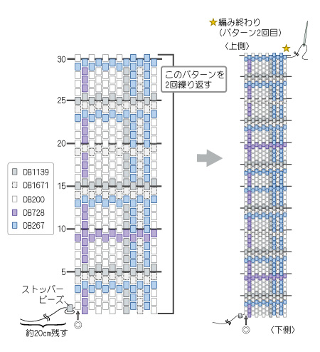 1 ビーズステッチ糸(K4570/#1)を約135cmに切り、糸端から約20cmの位置にストッパービーズを通し、ペヨーテステッチで下図のパターンを編む(◎編み始め)。 糸の残りが20cmくらいになったら一旦糸をそのままにしておく。 新たに約135cmに糸を切り、新たな糸の編み始めの糸始末をして続きを編み、編み終わりの糸をそのまま残しておく。 最初の糸の編み終わりの糸始末をする。