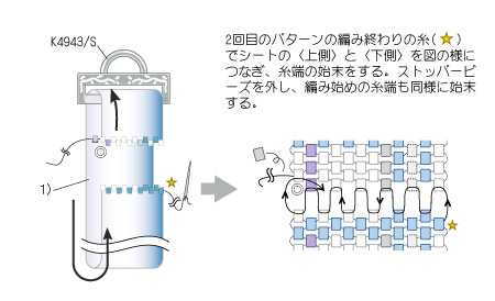 2 ステッチ用金具(K4943/S)に1)のシートを通し、残しておいた糸でつなぎ、糸始末する。