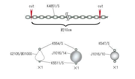 3 チェーン(K4851/S)を端に大きな輪が残るようにして、約10cmで切る。 アイピン(K547/S)とティーピン(K554/S)にチェッカーパール(J1014/10mm、14mm)・変形トライアングルビーズ(G2105/#50230)・キャップ(K5511/S)を通してピン曲げをし、パーツを作る。