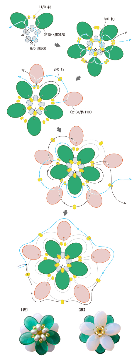 1 テグス(H4531)を60cmに切る。 レンティル(G2104/#50720、#71100)・丸大ビーズ 8/0(#3)・丸小ビーズ 11/0(#3)・特大ビーズ 6/0(#3960)を通して下図のように編み(☆編み始め・テグスの中心)、モチーフを作る。 テグスの編み終わりは、適度に引きしめて2~3回固く結び、近くのビーズ2~3コに通し、隠して切る。