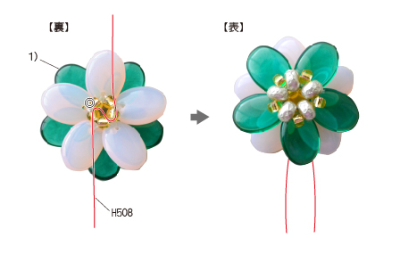 2 ワイヤー(H508)を20cmに切る。 モチーフの裏側に図のように通して、パーツを作る。(◎ワイヤーの中心) ※ワイヤーは通したり引きしめたりする際、ワイヤーの途中に輪が出来たまま引っ張ると切れることがありますので、注意してください。