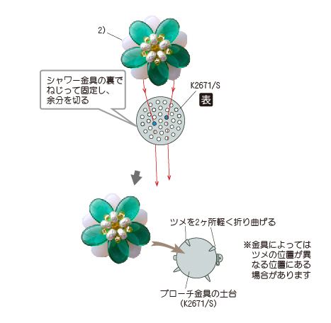 3 シャワー金具(K2671/S)に2)を図のように通し、裏側でねじって固定する。 ねじった後のワイヤーは5mmほど残して切り、倒しておく。 ブローチ金具(K2671/S)の土台のツメを軽く2ヶ所折り曲げてからシャワー金具をのせ、ツメを倒す。 残りのツメも全て倒してとめ付けて出来上がり。