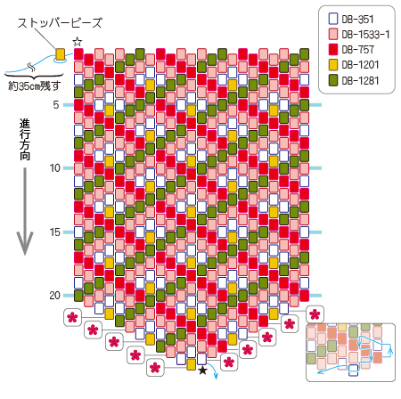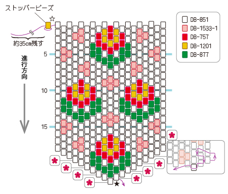 1 糸(K4570/#2)を1.2mに切り、糸端から約35cmの位置にストッパービーズを通し、ペヨーテステッチ(奇数目)で下図のパターンを編む(☆:編み始め)。
