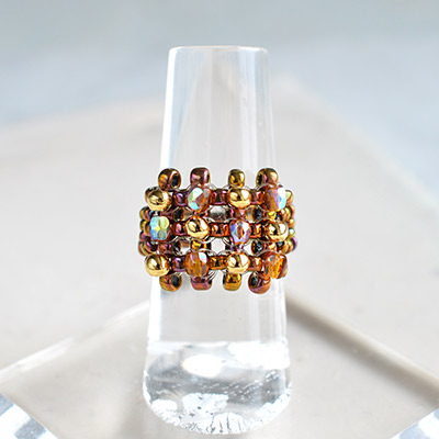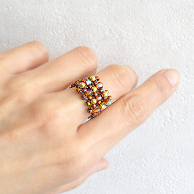 丸大ビーズをテグスで編んだ土台に、ファイアポリッシュビーズと本金メッキパーツを編みこんだ、四角いデザインがスタイリッシュなリングです。使用したビーズ・パーツは、それぞれ異なる輝きがあり、普段使いだけでなく、ちょっとしたお出かけにも活躍してくれる華やかさがあります。