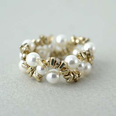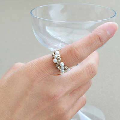 三角の形をしたスペーサービーズ(SPTR)とパールが絡むように並んだ模様が素敵なビーズリングです。テグスの交差編みで簡単に作れるので、ビーズワークが初めての方にもおすすめのレシピです。お好きな色のビーズとパールでアレンジもお楽しみください。