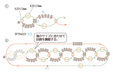 1 テグス(H4530)を50cmに切り、スペーサービーズ(SPTR4201)・パール(K251/3mm・4mm)を通して下図のように編んで出来上がり(☆編みはじめ・テグスの中心)。