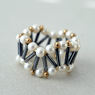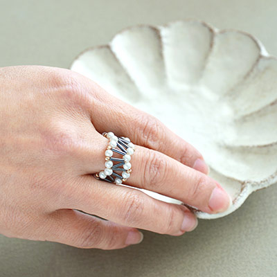 繊細なラインのスレンダービューグルビーズ(SLB)がリズミカルに並んだビーズリングです。テグスの交差編みで楽しく作れるレシピなので、はじめてのビーズワークにもおすすめです。