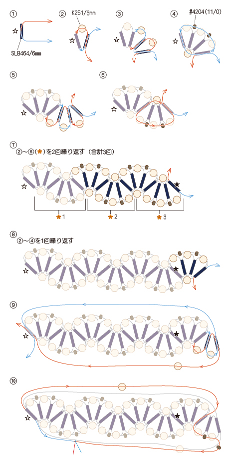 1 テグス(H4530)を1mに切り、スレンダービューグルビーズ(SLB464/6mm)・パール(K251/3mm)・丸小ビーズ(#4204)を通して下図のように編んで出来上がり(☆編みはじめ・テグスの中心)。