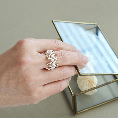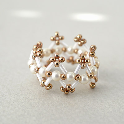 ユニークな幾何学的なパターンのビーズリングです。スレンダービューグル(SLB)が繊細なラインを作り、華やかな手元を演出します。テグスの交差編みで簡単に作れるので、はじめてのビーズワークにもおすすめのレシピです。