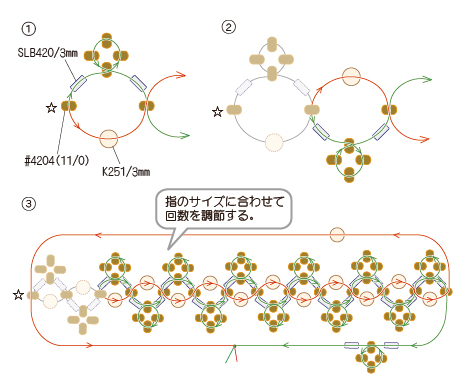 1 テグス(H4531)を80cmに切り、丸小ビーズ(#4204)・スレンダービューグルビーズ(SLB420/3mm)・パール(K251/3mm)を通して下図のように編んで出来上がり(☆編みはじめ・テグスの中心)。