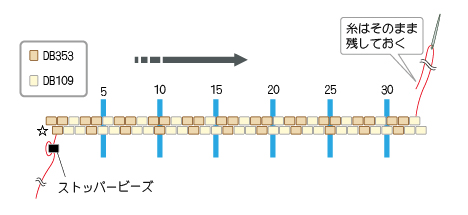 1 ビーズステッチ糸(K4570/#4)を1mに切り、糸端から約20cmの位置にストッパービーズを通し、デリカビーズ(DB109・DB353)をペヨーテステッチで下図のパターンを編む(☆編み始め)。 糸はそのまま残しておく。