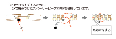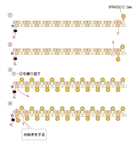 2 残しておいた糸でスペーサービーズ(SPR4202/2.2mm)を編みつける。 編み終わりの糸は糸始末する。