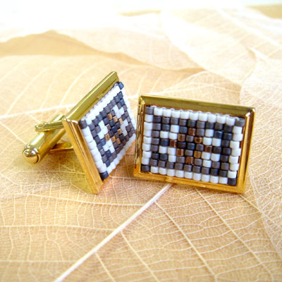 オリジナリティーに富んだ贈り物にデリカビーズ織りで作るカフスボタンはいかがですか?お揃いのネクタイピンでセットにするとさらに素敵です。